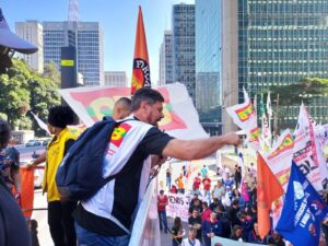 “Companheiros e companheiras, eu ouvi várias vezes aqui dizer que o Galípolo é pitoteiro. Eu não acho que é só isso. Eu acho que é um entreguista. Porque uma pessoa que preside o Banco Central do Brasil aumenta os juros para 14,25% e está pensando em aumentar amanhã mais meio, mais um por cento. Um por cento a mais são 56 bilhões que saem do orçamento público para quem não produz um prego, companheiro. Durante esses últimos 12 meses, foi entregue de mão beijada para o capital financeiro internacional mais de um trilhão de reais. Quase todo o orçamento do Brasil. Aí, depois, fica pedindo para cortar recursos da saúde, da educação, para dar para os bancos. Fica pedindo para reduzir o reajuste do salário mínimo, reduzir o Bolsa Família, reduzir o fundo da educação básica. Tudo isso para dar dinheiro para os bancos. É preciso que o Ministério da Fazenda e da Economia deixem de dar dinheiro aos banqueiros e venham ao lado da nação e do povo brasileiro. É preciso investir em emprego decente. Esse negócio de dizer que estamos com pleno emprego, com gente carregando comida nas costas e não podendo comer, isso não é emprego decente. Motoboys sem direito nenhum, isso não é emprego decente. Precisamos fortalecer a indústria de base, a indústria de máquinas, para gerar emprego e salário decente. A indignação está aumentando. Água mole em pedra dura, tanto bate até que fura, companheiros. E nós vamos ganhar essa luta com os estudantes, com os trabalhadores, com as mulheres — essas maravilhosas mulheres que lutam contra a carestia. Como é que pode? Um quilo de café a 60, 70 reais. Estamos comendo pé de galinha. Mas aqui tem gente disposta a lutar pelo nosso país.”